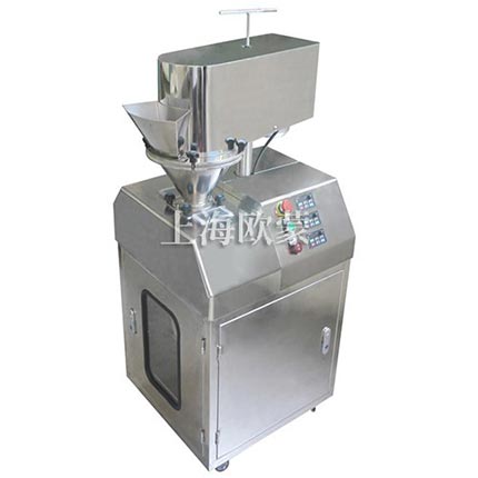 本機有送料機構、壓片機構、液壓機構、機架和電氣控制等部件組成,送料,壓片、制粒均采用變頻無級調速,油泵壓力可調,成品細度可以通過更換不同的篩網獲得。改進制粒轉籠,增加了顆粒的成品率。本機裝拆、清洗方便,與物料接觸部分皆為不銹鋼制作。產品符合GMP要求。物料由頂部送料漏斗加入,經兩壓輪強制擠壓成片狀后進入下部制粒室,在制粒室中片狀物料被制粒刀片打碎,然后進入整粒室,直至顆粒小于或等于網孔徑,顆粒通過網篩到盛料托盤。所需要顆粒大小可以通過調整篩網大小來決定。